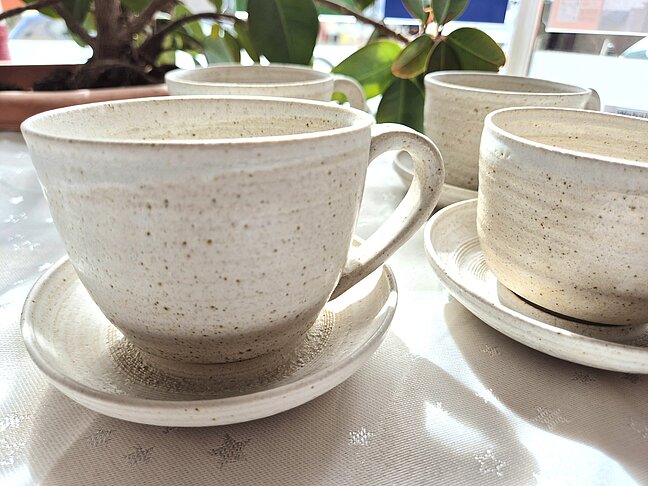 Thrown stoneware cup and saucer set in simple creamy matt glaze.